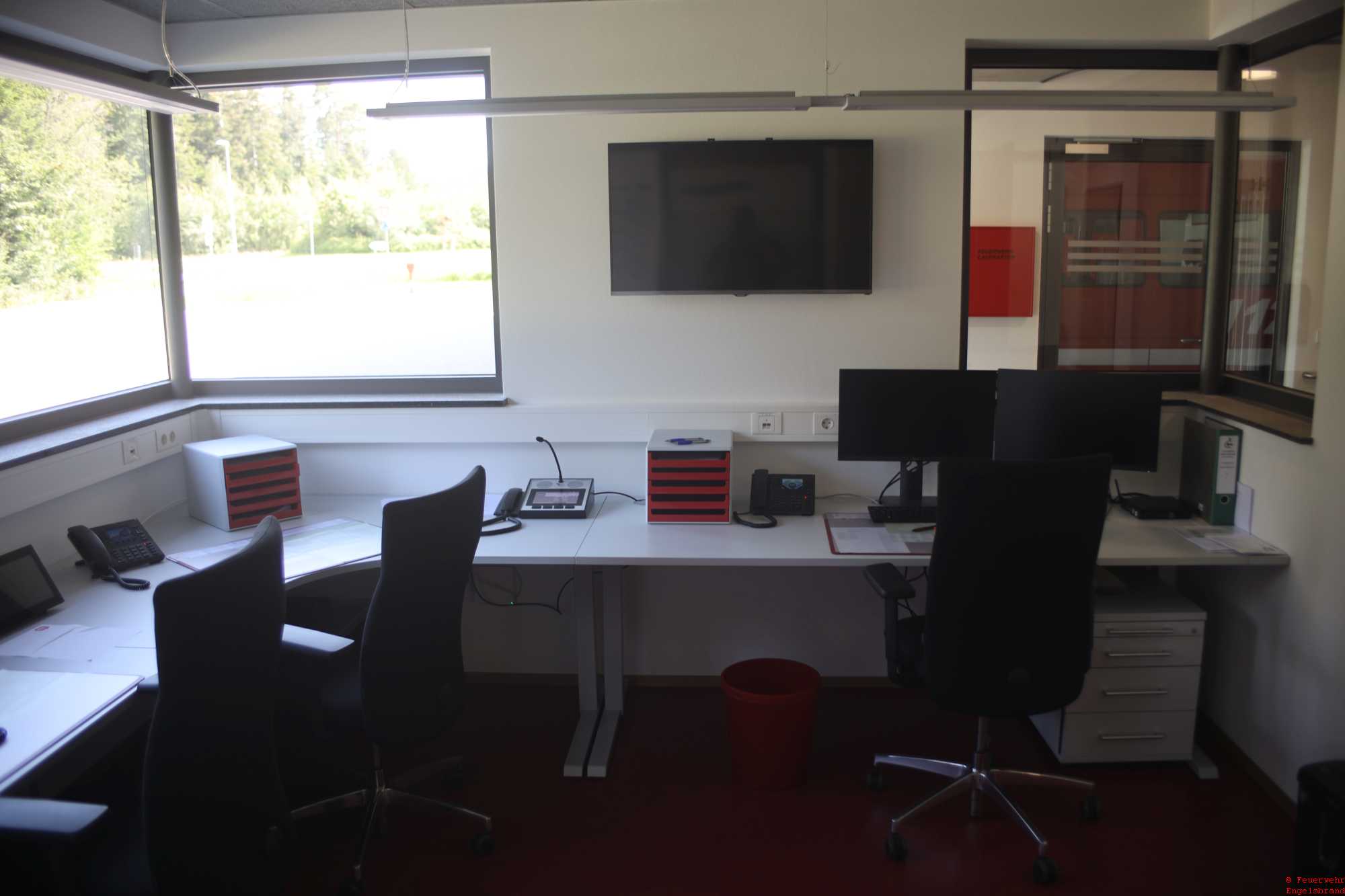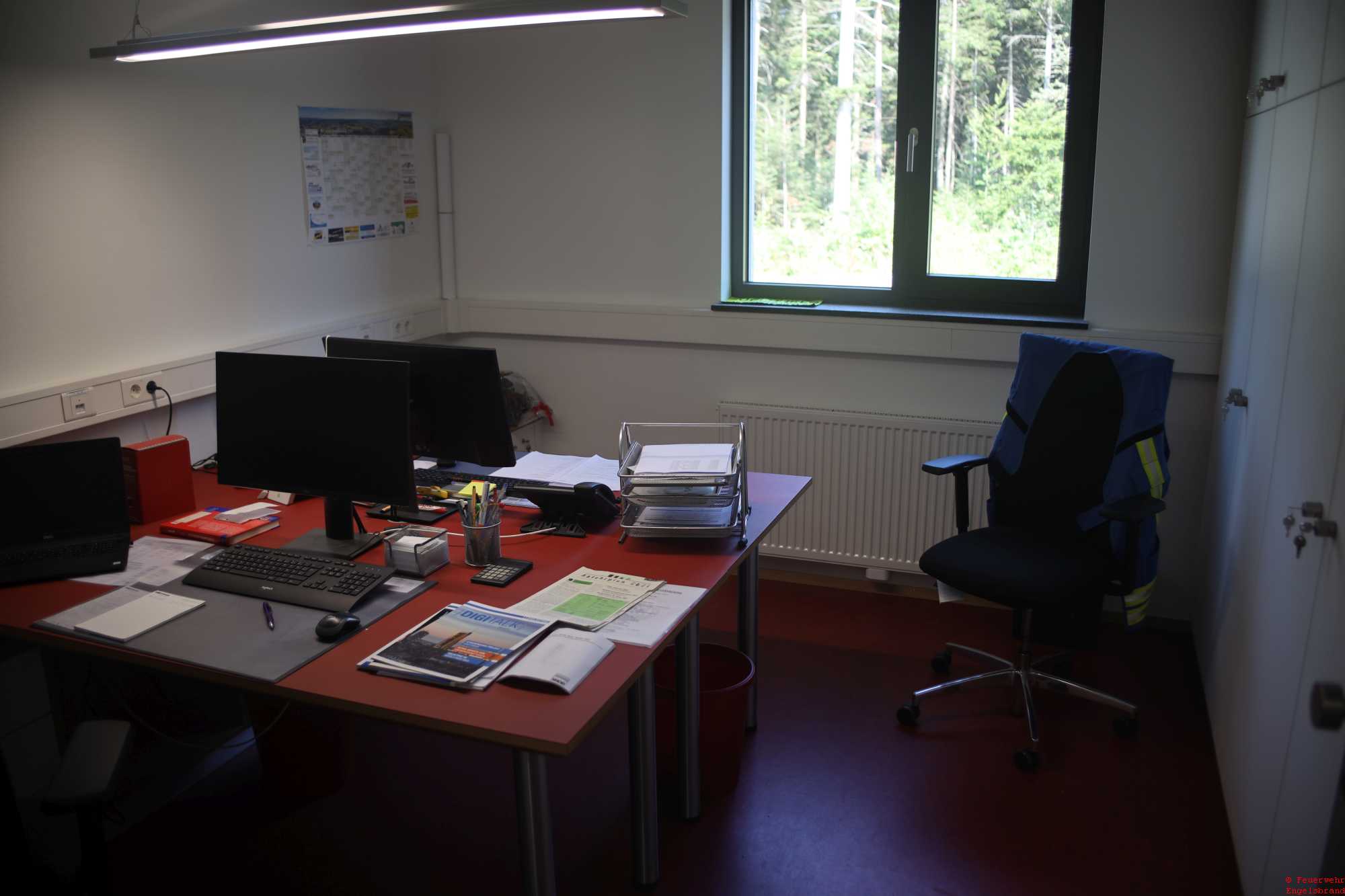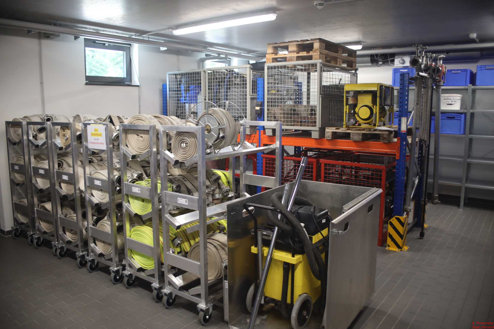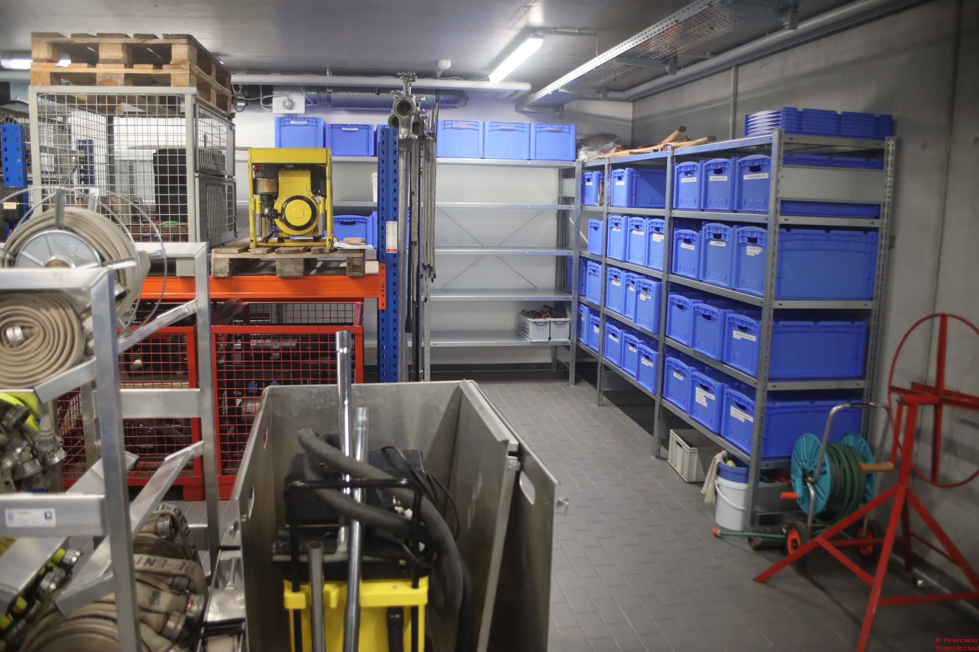 Die Fahrzeughalle beinhaltet 5 Fahrzeugstellplätze, dahinter befinden sich Werkstatt, Materiallager, Trockenraum, Notstromversorgung.