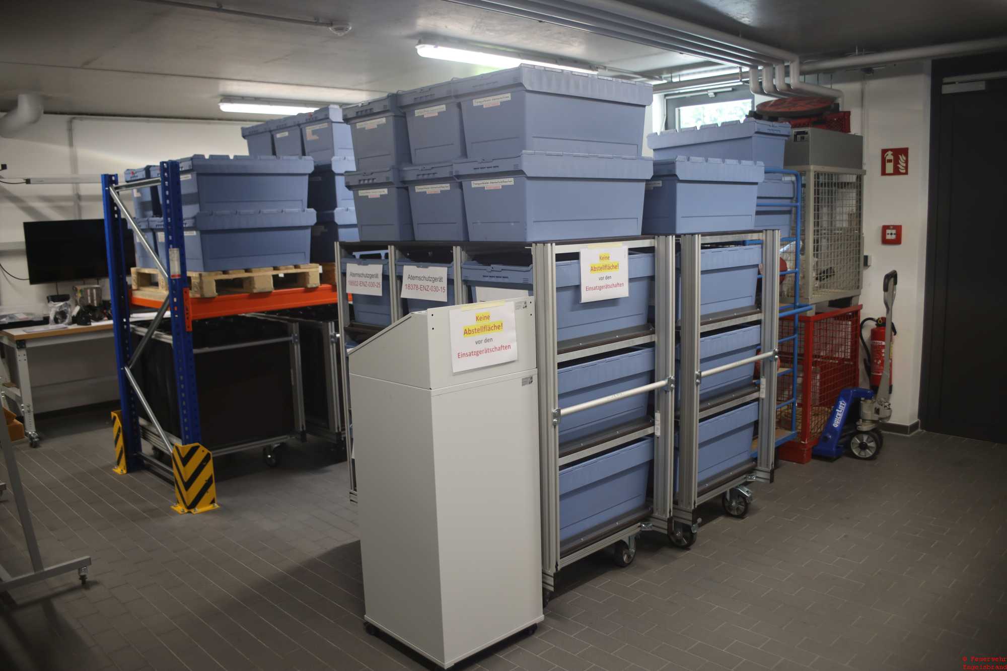 Das Materiallager hat auch einen direkten Zugang von außen, neben dem sich auch ein Waschplatz für die Fahrzeuge befindet. Von den Parkplätzen gibt es 2 Alarmeingänge durch welche man auf kürzestem Weg zu den Spind Räumen gelangt.